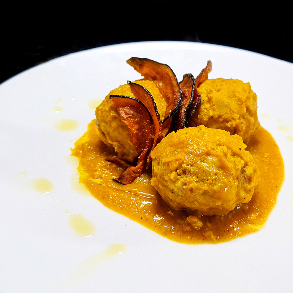 - Servire le polpette su un letto di salsa di zucca con le chips in sommità e condire un filo d’olio evo a crudo.